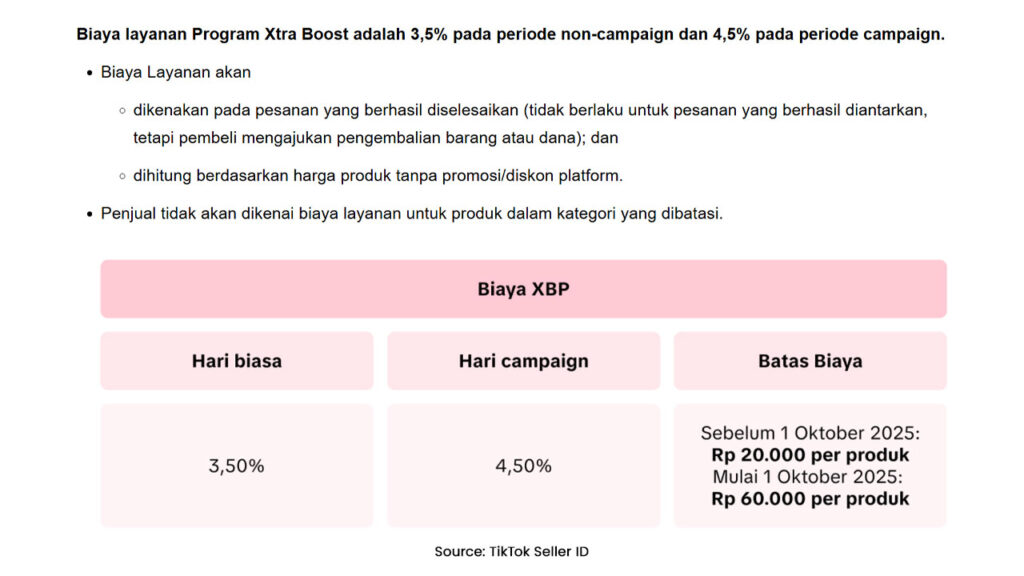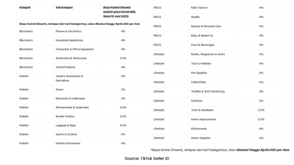 TikTok Shop menerapkan Biaya Komisi Dinamis yang mencakup program Gratis Ongkir dan Voucher Pengiriman Xtra. Besaran biaya komisi dinamis ini berkisar antara 4% hingga 6%, tergantung pada kategori produk, dengan batas maksimum Rp40.000 per item.