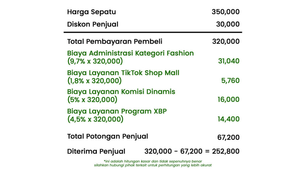 - Sepatu masuk ke Kategori Fashion Maka Biaya Adminnya 9,7% dan 1,8% untuk Biaya Layanan TikTok Shop Mall